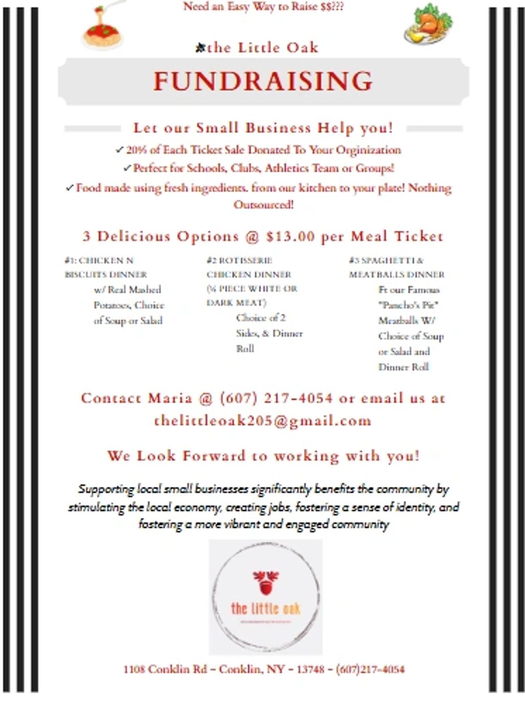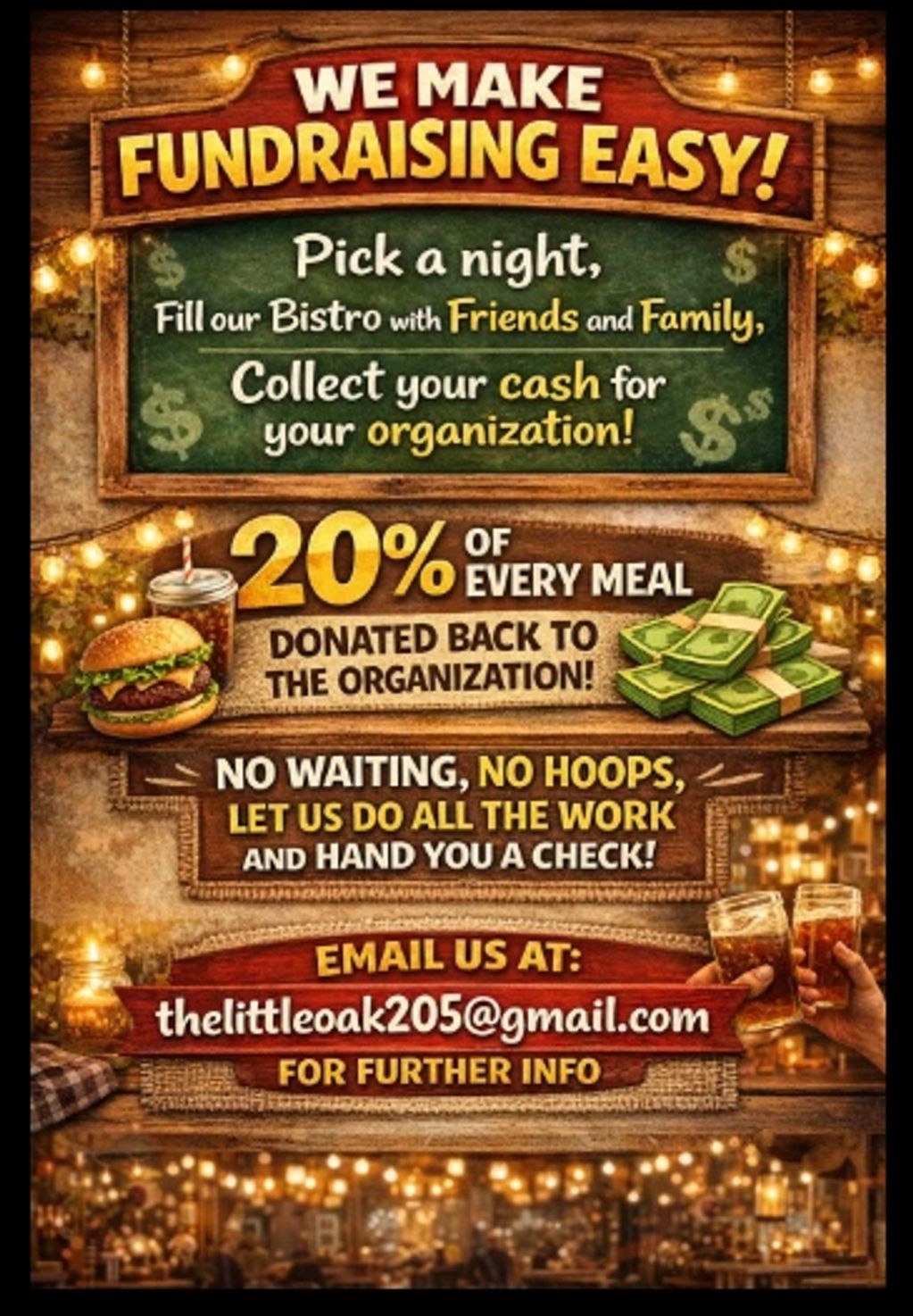 Pick a Night. Fill Our Bistro with Family & Friends. Collect your cash! 20% of Every Meal is donated back to the orginization.